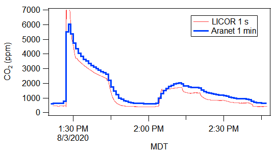 Dr. Demetrios Pagonis in my research group performed a quick experiment comparing the Aranet sensor with a research grade LI-COR sensor. The results are below. The LI-COR sensor provides data every 1 s, while the Aranet does so every 1 min. Overall I would call the results very good, for an affordable sensor like this one. Some deviations are clearly due to time response, since the Aranet does not have a sample flow and has to rely on the CO2 diffusing into the sensor volume. There is also a positive offset in this particular sensor which I have not managed to remove yet (maybe I don’t quite understand the manual on how to do this), but that is not a concern for the time response calculations. And it can be subtracted in your head, after measuring the air outdoors.