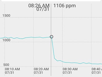 The graph below is a screenshot of the CO2 monitor app in my phone. The CO2 level responded very quickly, with most of the response within the 1 minute time response of the analyzer. This is more than adequate to measure ventilation rates in any indoor environment.