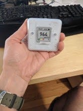 Aranet4 CO2 analyzer, with my hand for scale. This is the manual There are many other monitors that can probably do the same thing. Look for NDIR technology. I chose this one because it does have a display, traffic light feature, and Bluetooth connectivity, in addition to the endorsement from REHVA.