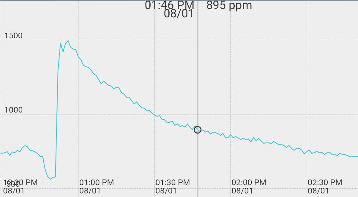 To illustrate what I expect is a more typical result, I redid the experiment with a window partially open. In this case the CO2 decay was much faster, and I estimate 1.2 h-1 under this condition.