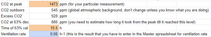 For the example below, the outdoor level was 545 ppm (the monitor has an offset, which can be adjusted, but that is not important for this measurement). The CO2 peak was 1473 ppm when the person left the space at 6:43 pm, so the excess CO2 above ambient was 928 ppm. We need to look at the time in which it decays to 879 ppm (= 545 ppm + 37% * (1473–545)). CO2 was still 1066 ppm when I removed the analyzer from the space at 7:09 am. From the rate of decay (40 ppm in the final hour), it would have taken another 4.5 hours to reach 886 ppm approximately. So the decay time is ~15.5 h, and the ventilation rate is 1 / 16 = 0.06 h-1. There is a little spreadsheet calculator on the ventilation section of the estimator, where you can enter the numbers and it does the calculations for you: